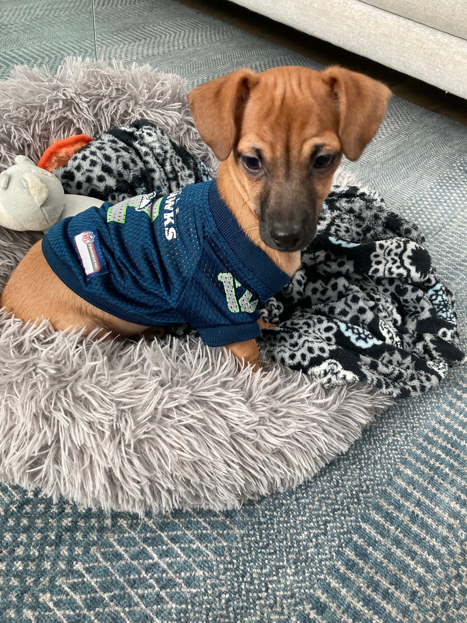 He can be a little cautious when meeting new people, but once he warms up, he’s affectionate and loyal—your biggest fan and best cuddle buddy. Like most puppies, he’s still learning proper manners and is working on redirecting his mouthiness to chew toys.