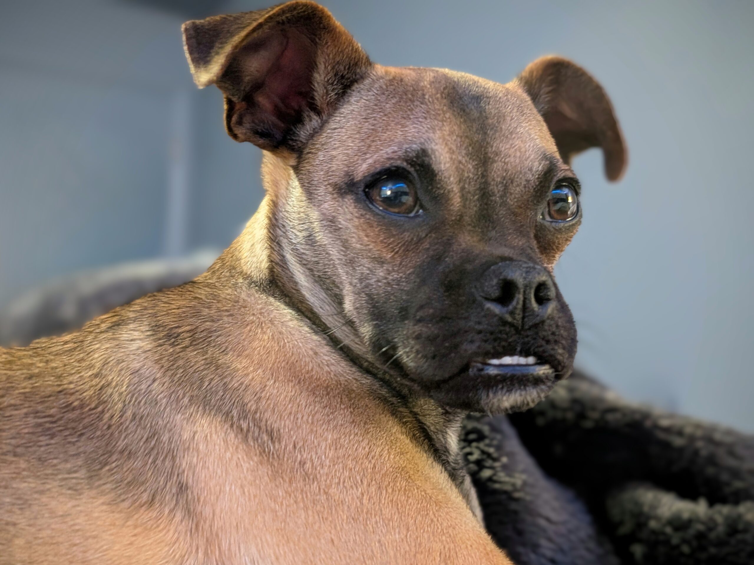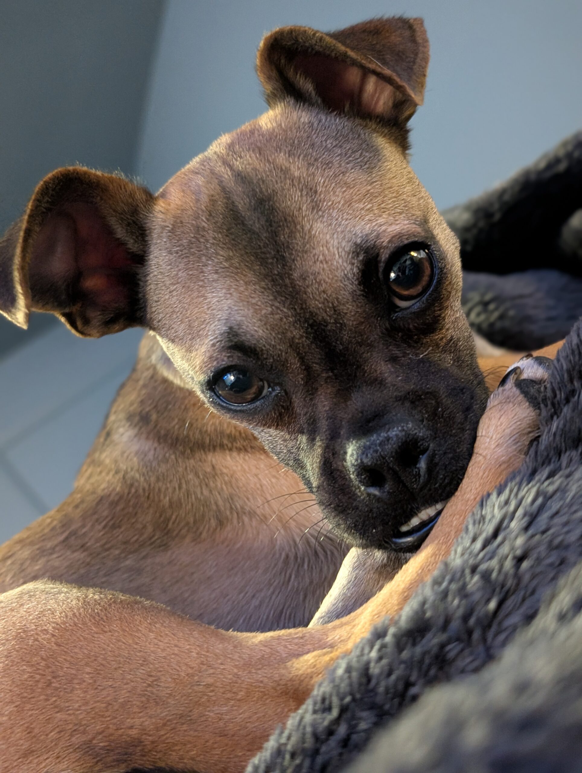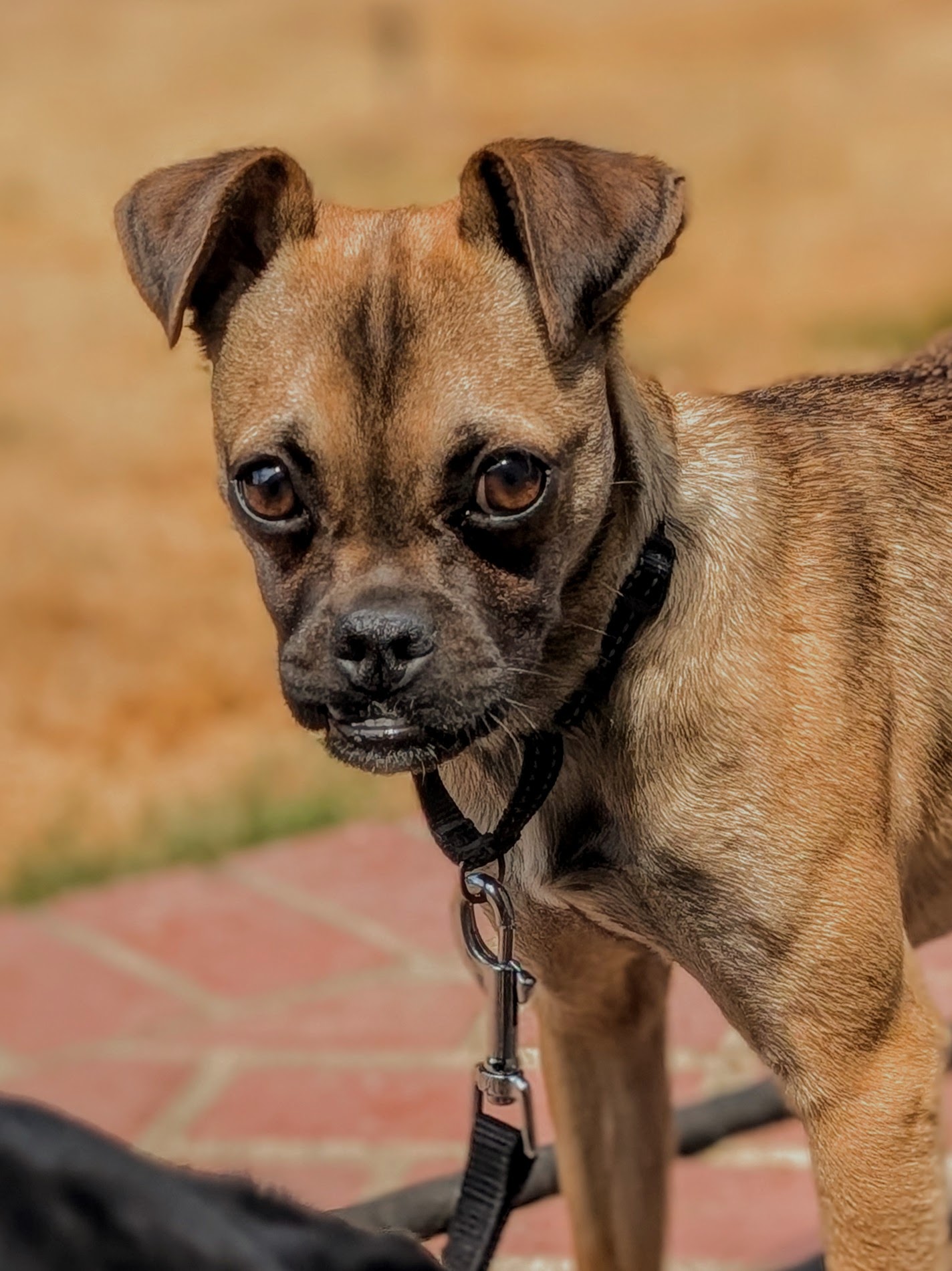 Meet Tito’s Saketini—aka Sake! This pint-sized pug-chihuahua mix is a shy guy with a heart of gold and a name as smooth as his cuddle game. Sake may start off timid, especially around new people and experiences, but with a little patience and a lot of love, he blossoms into a playful, affectionate companion.