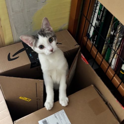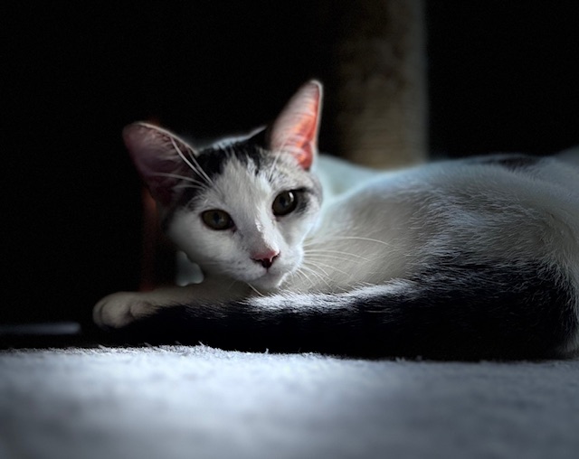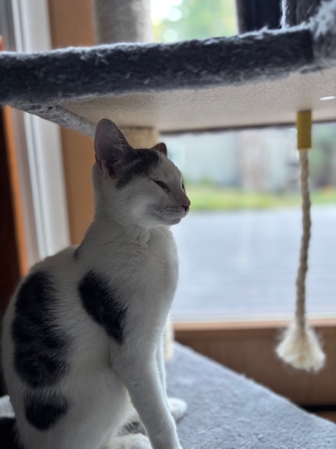 She must be adopted with her siblings Rhythmic Blue or into a home with a social cat/kitten to be her companion and playmate.