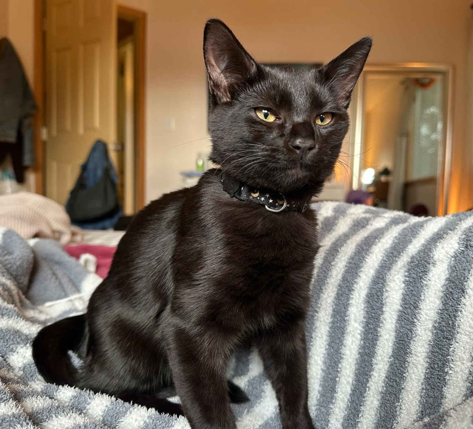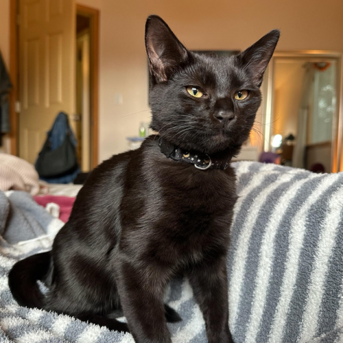 The smallest of his litter, Smokebush is a lap-loving sweetheart who thrives on cuddles and cozy snuggles. Don’t let his size fool you – he has plenty of playful energy, especially when there’s a string toy involved. Smokebush is the perfect mix of gentle affection and playful charm, always happiest curled up in a warm lap after a round of chasing toys. He loves people and will follow his favorite person from room to room. Smokebush is well adjusted to gentle children of any age and loves pets and snuggles from everyone! He has impeccable litterbox habits as well as the cleanest, softest fur you can imagine. Speaking of fur, he might look like a Halloween kitty, but he has the most adorable peppering of grey/white hairs mixed in all throughout his black fur. He is bonded with his brother, Sweetspire, and the pair must be adopted together.